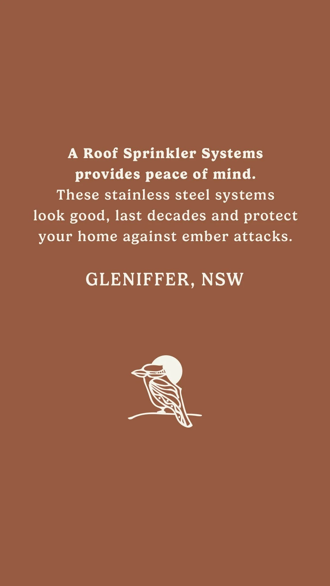 "We are thrilled with the roof sprinkler setup and have a new level of confidence in the face of bushfire risks. The service was professional, and the system's performance has been outstanding. We feel much safer knowing that we are better protected. We also received a significant reduction in our farm insurance premium."